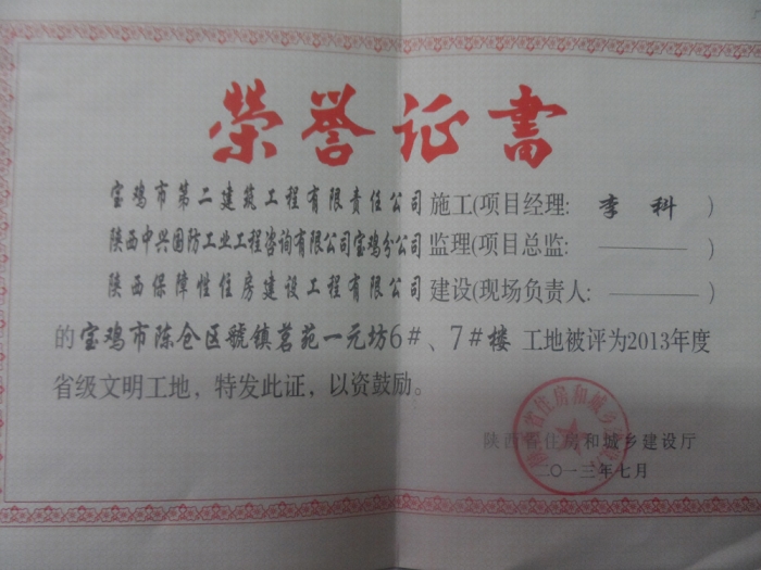 2013年省級文明工地(虢鎮(zhèn)名苑)