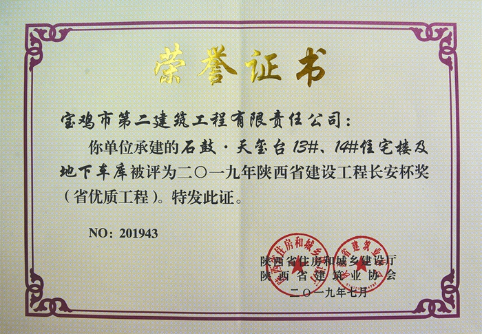2019年陜西省建設(shè)工程長(zhǎng)安杯獎(jiǎng)(石鼓?天璽臺(tái)13#、14#住宅樓及地下車庫)