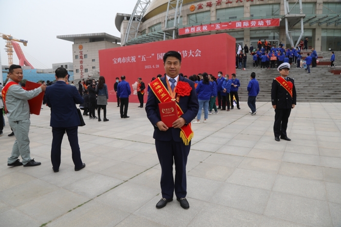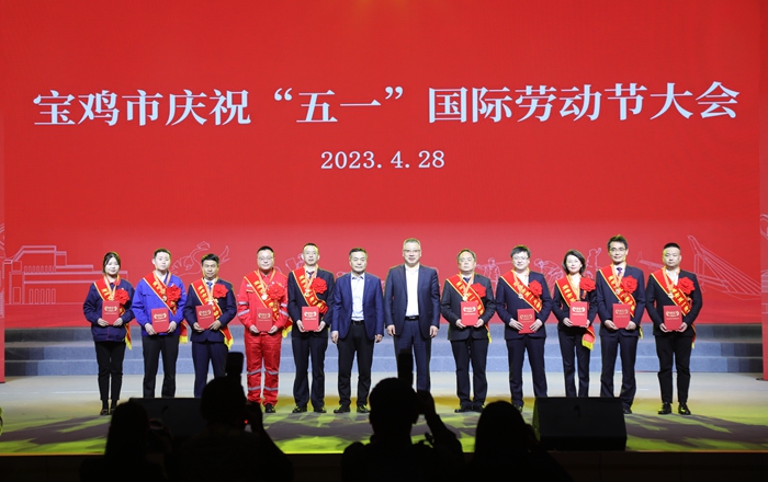 4月28日,在寶雞市慶?!拔逡弧眹?guó)際勞動(dòng)節(jié)大會(huì)上,集團(tuán)公司李紅軍同志被寶雞總工會(huì)授予五一勞動(dòng)獎(jiǎng)?wù)拢⑸吓_(tái)領(lǐng)獎(jiǎng)。(左三)